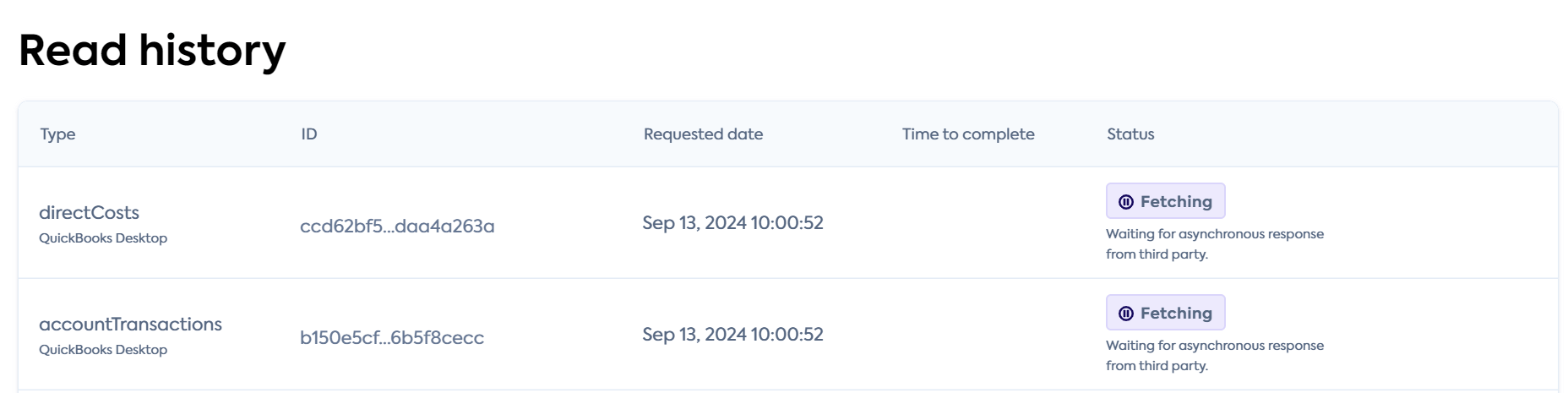 When a data type syncSync The process of fetching the latest data from a connected data source. Syncs can be triggered manually or run automatically on a schedule. is listed as Fetching with the additional Waiting for asynchronous response from third party message, we try to surface the associated issue in Companies > CompanyCompany In Codat, a company represents your customer's business entity. Companies can have multiple connections to different data sources. > Data history of the Codat Portal and in the connectionInfo property of our Get connection endpoint.